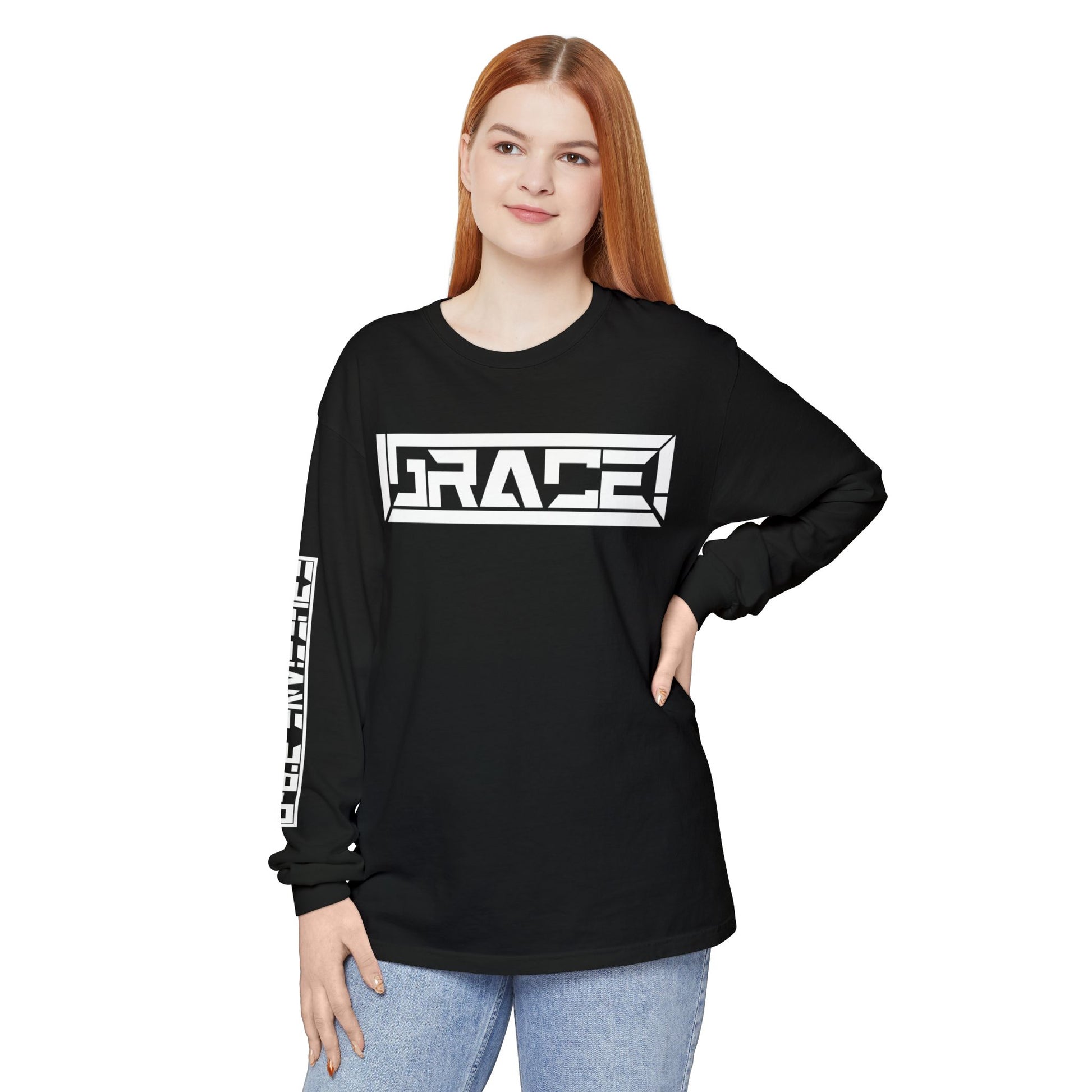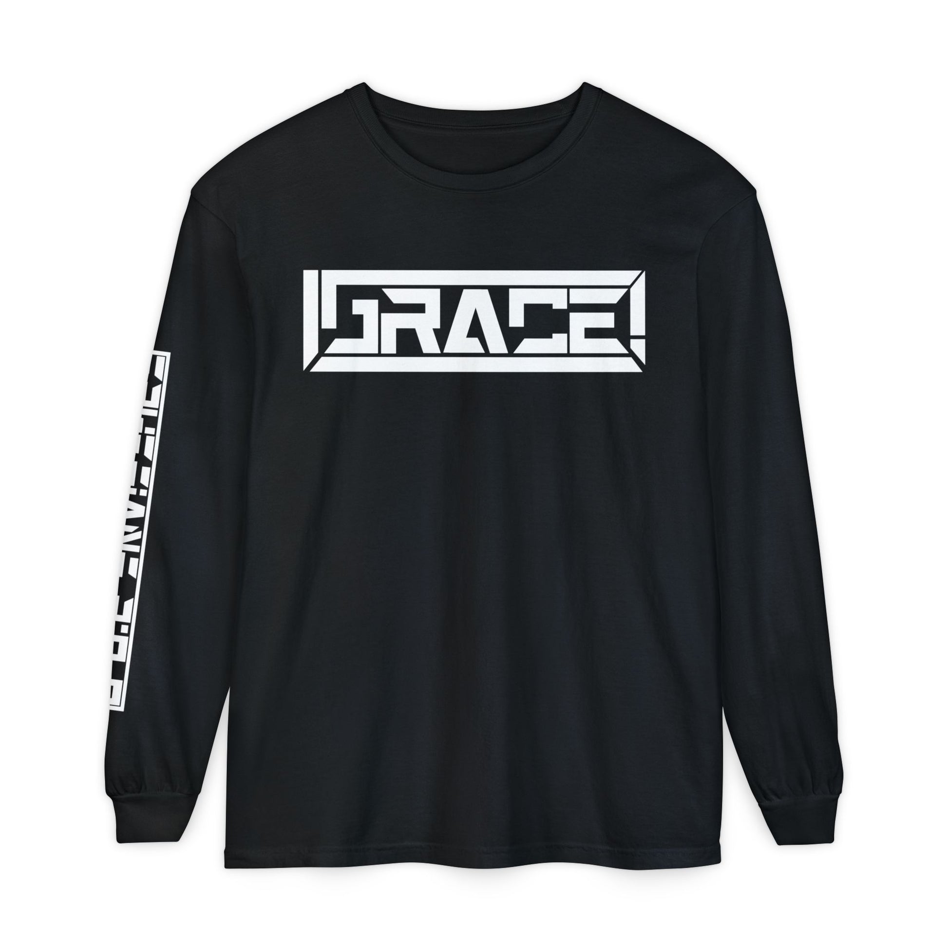 Grace! This classic long sleeve Tee boldly announces God’s Grace! The right sleeve has “Ephesians 2:8-9” in the same modern bold design running down arm! You can wear it and share it, everywhere you go!